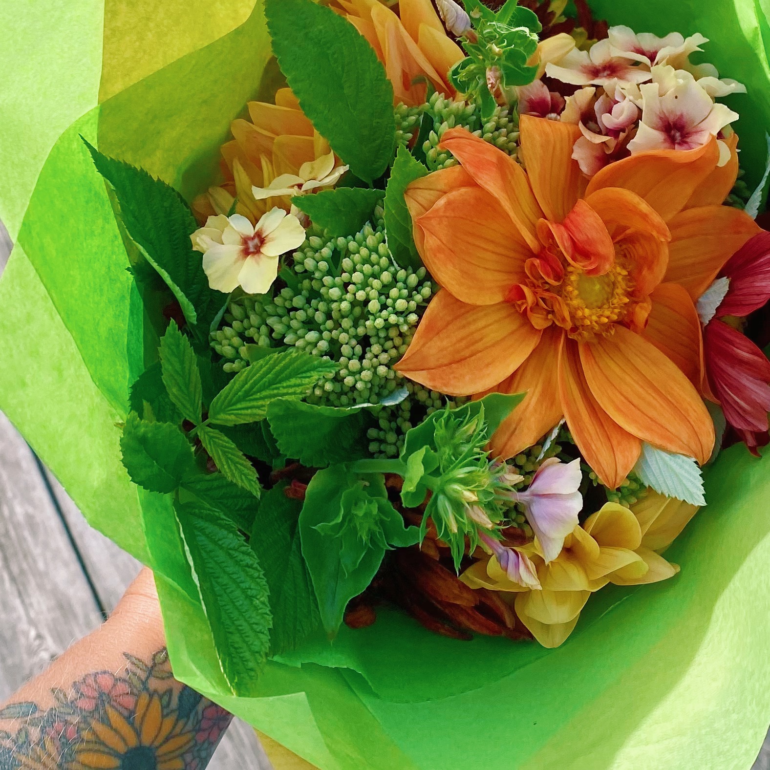 Buketter binds med ett urval av Rebeccas favoritblommor – dahlior, solrosor, lejongap, sommarflox, blomstermorot och annat från våra odlingar och det vilda kring Wieselgrensgården.