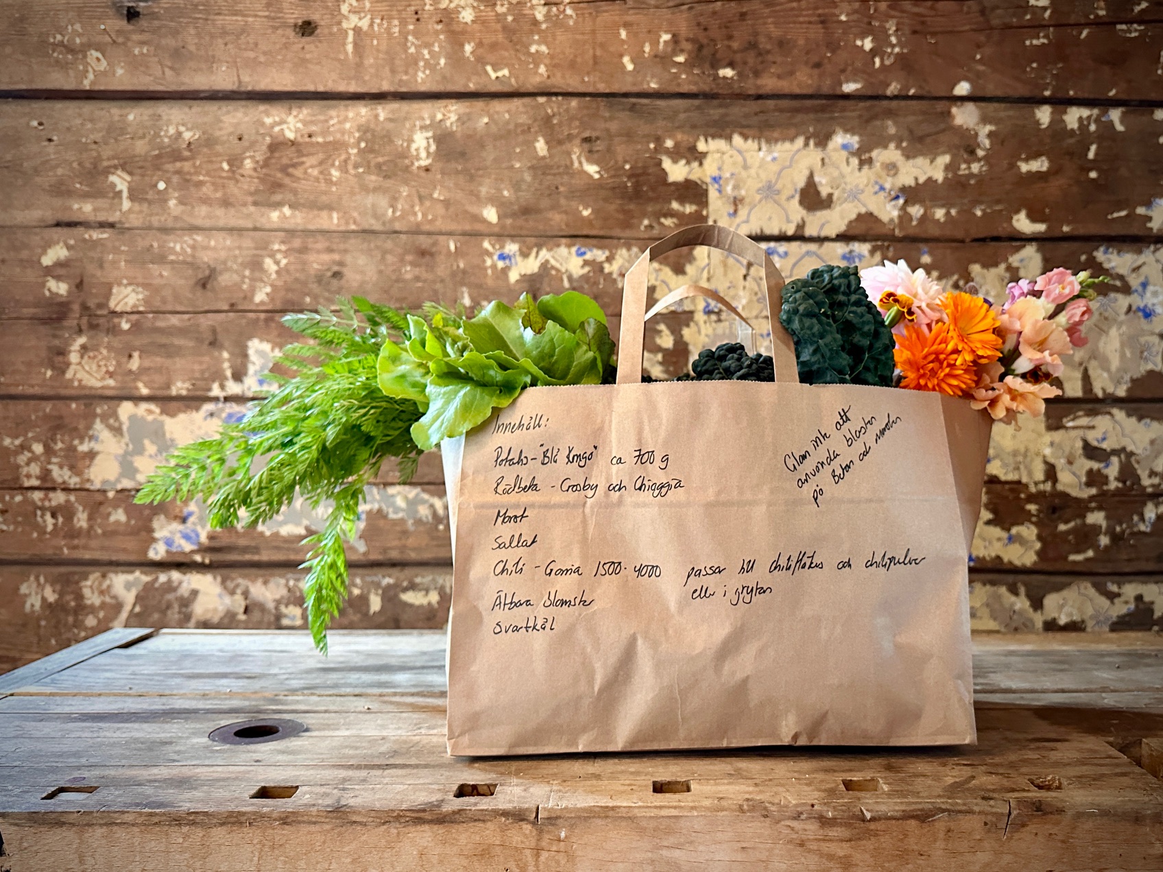 Innehåll: Varje kasse innehåller 5–8 olika sorters grönsaker, inklusive örter och potatis. Den räcker till 1–2 personer som äter mycket grönsaker, eller till en familj som har dem som komplement. Prenumerationen sträcker sig från vecka 31 till och med vecka 38 – åtta veckor av färska, närproducerade grönsaker.